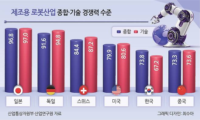 로봇산업은 AI기술과 맞물리며 전 세계적으로 급성장하고 있다. 오는 2026년 시장규모는 약 108조원에 이를 것으로 예상된다. 특히 AI·센서 기술이 결합된 휴머노이드 로봇은 산업 간 경계를 무너뜨리며 새로운 시장을 창출할 전망이다. 그러나 국내 제조용 로봇산업 경쟁력은 일본, 독일, 스위스, 미국, 중국에 이어 6위 수준이다. 기술력과 부품 국산화율이 낮아 핵심부품인 감속기 등 구동부의 80%를 수입에 의존하고 있다.