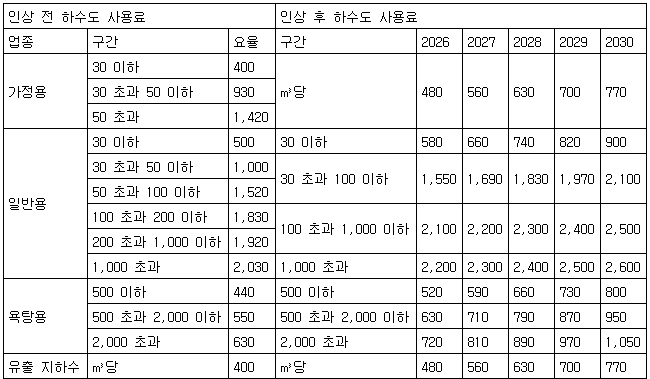 시의 요금 인상 계획을 세부적으로 보면 가정용 하수도 요금은 현행 t당 400원(30t 이하 구간)에서 2026년 t당 480원, 2027년 560원, 2028년 630원, 2029년 700원, 2030년 770원까지 올린다.