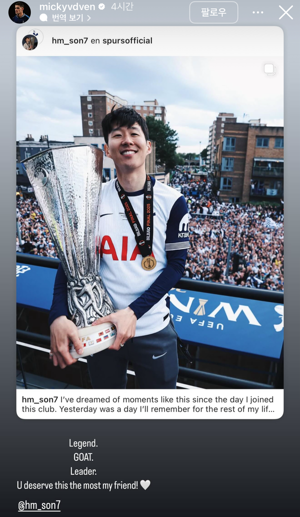 "레전드, GOAT, 리더" 유로파 우승 이끈 판더펜, 손흥민 무한찬양