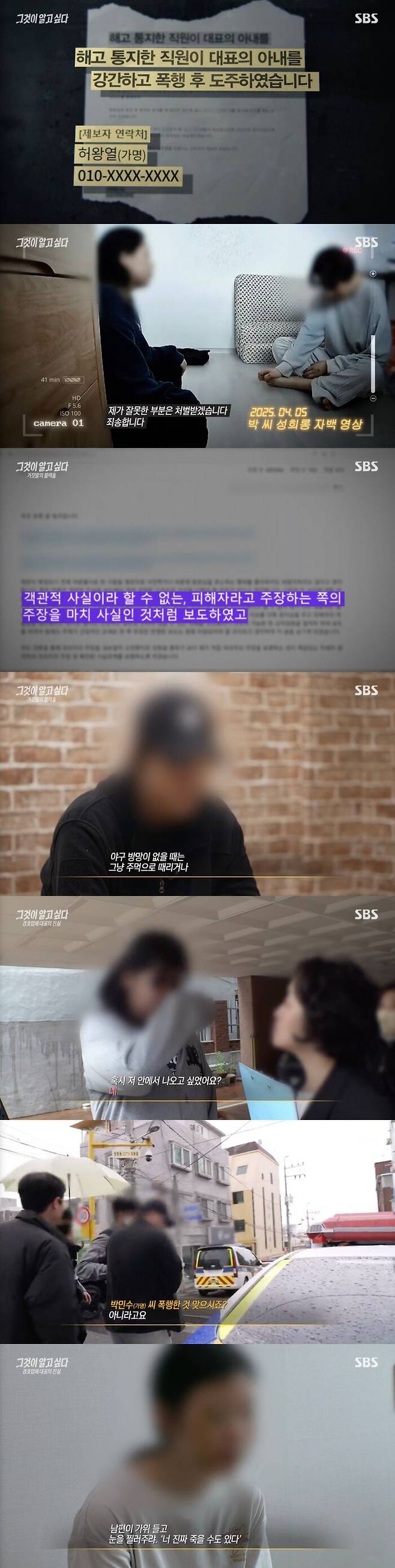 원장을 만난 이 씨는 바로 눈물을 터뜨리며 그동안 자신이 겪었던 일을 고백했다. 어느 순간부터 폭행이 시작된 허 대표. 그는 자신도 감금 폭행했고 박 씨가 대표의 아내를 강간한 것은 사실이 아니라고 말했다.