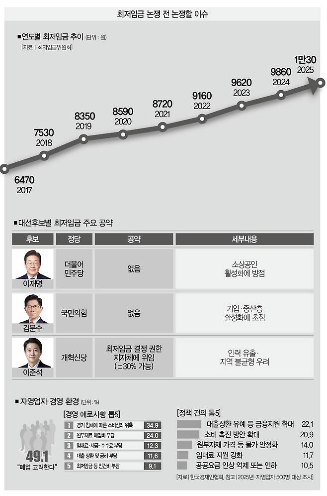이런 맥락에서 최저임금 1만원 달성은 늦은 감이 없지 않다. 당시 후보들이 내걸었던 시점보다 3~5년 후에야 이뤄졌기 때문이다. 물론 여기엔 문재인 정부가 집권 첫해인 2018년 최저임금을 16.4%나 끌어올린 게 영향을 미쳤다. 한꺼번에 큰폭의 인상을 단행하면서 자영업자들의 반발을 샀고, 이를 기점으로 경영계가 주장하던 '최저임금 인상론'에 힘이 실렸다.