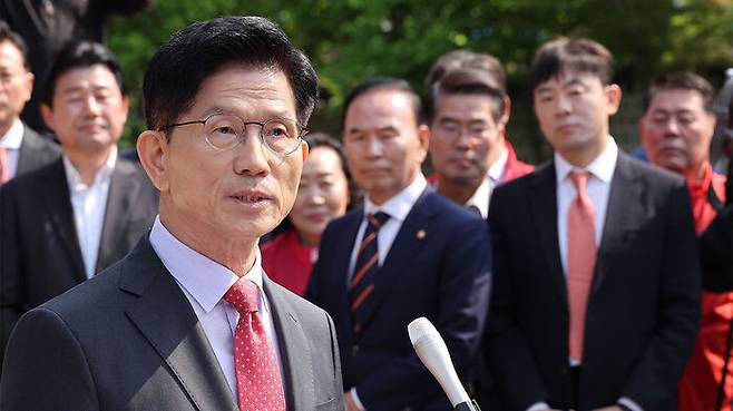 ▲ 국민의힘 김문수 대선 후보가 25일 충북 옥천군 육영수 여사 생가를 방문한 뒤 취재진 앞에서 현안 관련 입장 발표를 하고 있다.