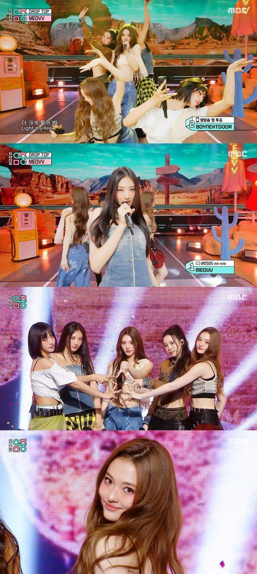 지난 24일 방송된 MBC '쇼! 음악중심'에 MEOVV(미야오)가 출연, 첫 EP 'MY EYES OPEN VVIDE'의 더블 타이틀 'DROP TOP'(드랍탑) 무대를 선보였다.