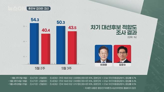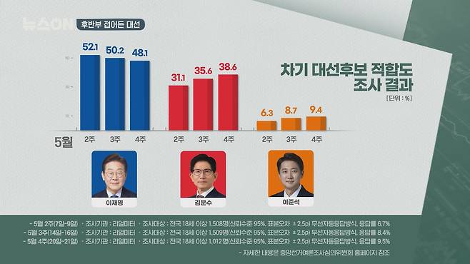 리얼미터가 에너지경제신문 의뢰로 진행한 차기 대선 후보 적합도 조사 결과를 보면, 5월 2주차에서 4주차까지 다자대결 구도 추이를 보면 이재명 후보의 지지율은 50% 초반에서 48.1%로 소폭 줄어든 반면, 김문수, 이준석 후보는 소폭 상승하는 추이를 보였습니다.