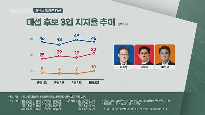 4개 여론조사기관이 실시한 전국지표조사가 5월 22일 공표됐는데요. 5월 1주차부터 5월 4주차까지 추이를 보면 이재명 후보는 46~49% 지지율을 보이고 있고, 김문수 후보는 25%에서 5월 4주차에는 32%로 소폭 올랐습니다. 이준석 후보는 5월 4주차에 10%로 처음 두 자릿수를 보였습니다.