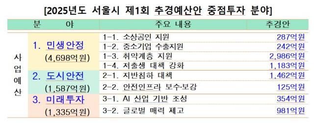 서울시 관계자는 “경기 불황에 따른 소비 위축, 수출 부진 등의 위기에 직면한 상황 속에 민생안정·도시안전·미래투자 등 3대 축을 중심으로 올해 첫 추경을 단행한다”며 “위기를 기회로 변화시킬 수 있는 골든타임을 놓치지 않기 위해 의회 의결 즉시 추경 예산을 신속 집행하겠다”고 밝혔다. 서울시는 민생안정(4698억원), 도시안전(1587억원), 미래투자(1335억원) 등 이른바 3대 분야에 총 7620억원의 예산을 추가 투입하기로 했다.