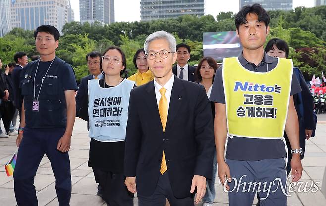 | ▲ 고공·옥쇄·단식 농성 노동자와 함께 입장한 권영국 후보 권영국 민주노동당 대선 후보가 23일 서울 여의도 KBS 스튜디오에서 열리는 제21대 대통령선거 후보자 2차 토론회에 고공·옥쇄·단식 농성을 했던 노동자, 활동가들과 함께 입장하고 있다. 권 후보는 "노동자들이 스스로를 어딘가에 가두고 농성해야 간신히 목소리가 들리는 사회는 정상적이지 않다"라며 "오늘 사회 분야 토론회에 이들의 대변인을 자처하는 심정으로 임하겠다"라고 그 취지를 밝혔다. 앞줄 왼쪽부터 임금 회복을 촉구하며 0.3평 철제감옥에 스스로를 가둔 유최안 거통고지회 당시 부지회장, 장애인 탈시설 권리를 촉구하며 혜화동성당 종탑에 올랐던 민푸름 활동가, 권 후보, 이틀 전 고공농성 500일을 넘긴 한국옵티칼하이테크 최현환 지회장, SPC의 노조파괴에 맞서 53일 단식 농성을 벌였던 임종린 파리바게트지회장. |