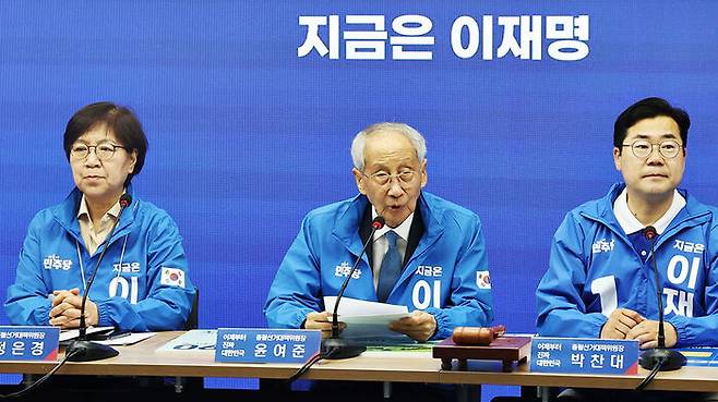 ▲ 더불어민주당 윤여준 총괄선대위원장이 21일 서울 여의도 당사에서 열린 중앙선거대책위원회의에서 발언하고 있다.