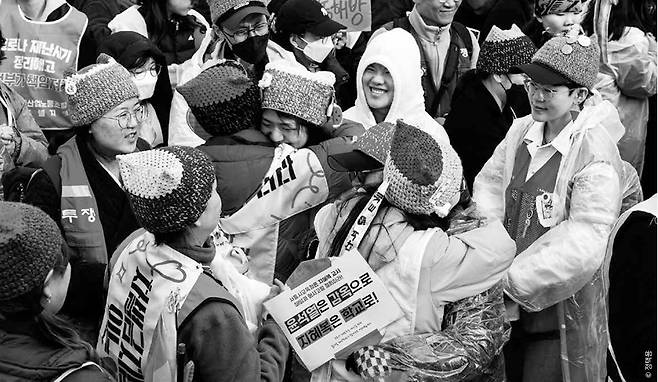 정말로 이상한 일이다. 거기 모인 사람들 대부분은 고공 농성 전까지는 박정혜, 소현숙을 몰랐을 것이다. 그럼에도 우리는 두 사람을 두고 집에 가는 게 아쉬워서 계속 뭉그적대며 노래를 부르고, "힘내라"고 외치고, 이대로 헤어지기 싫어서 울었다. 그 마음들은 뭘까? 땅과 하늘 사이 9m의 거리를 두고 맺어지는 그 관계는 뭘까? 서로에게 익명이나 마찬가지인 사람들이 동지가 되는 그곳에서는 어떤 마법이 일어나는 걸까?