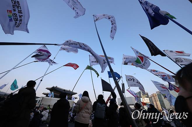 | ▲ ‘윤석열 즉각 퇴진, 사회대개혁, 9차 범시민대행진’이 지난 2월 1일 오후 서울 종로구 광화문앞에서 윤석열퇴진비상행동 주최로 열린 가운데 참가자들이 다양한 깃발을 흔들고 있다. |
