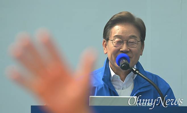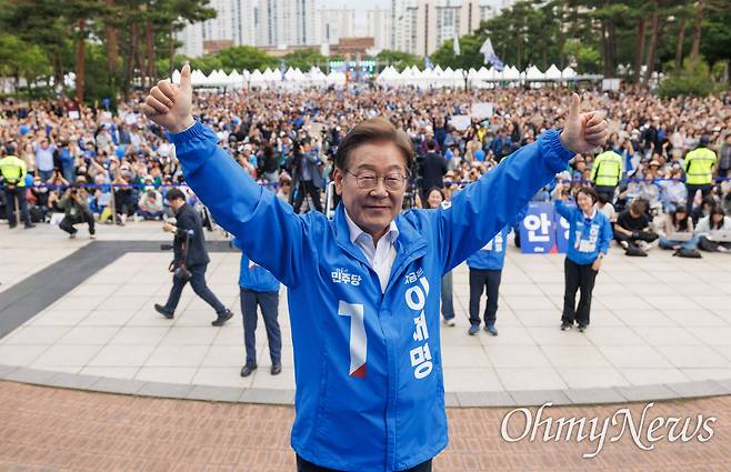 | ▲ 이재명 더불어민주당 대선 후보가 24일 오후 경기도 안양시 평촌중앙공원 집중 유세 현장을 찾아 지지를 호소하고 있다. |