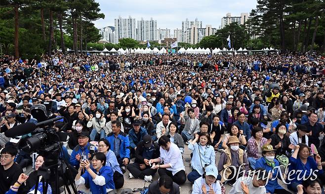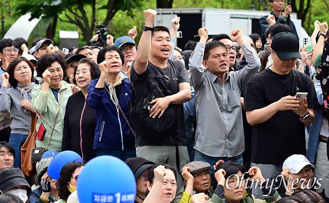 | ▲ 이재명 더불어민주당 대선 후보가 24일 오후 경기도 안양시 평촌중앙공원 집중 유세 현장을 찾은 가운데 지지자들이 "이재명"을 연호하고 있다. |