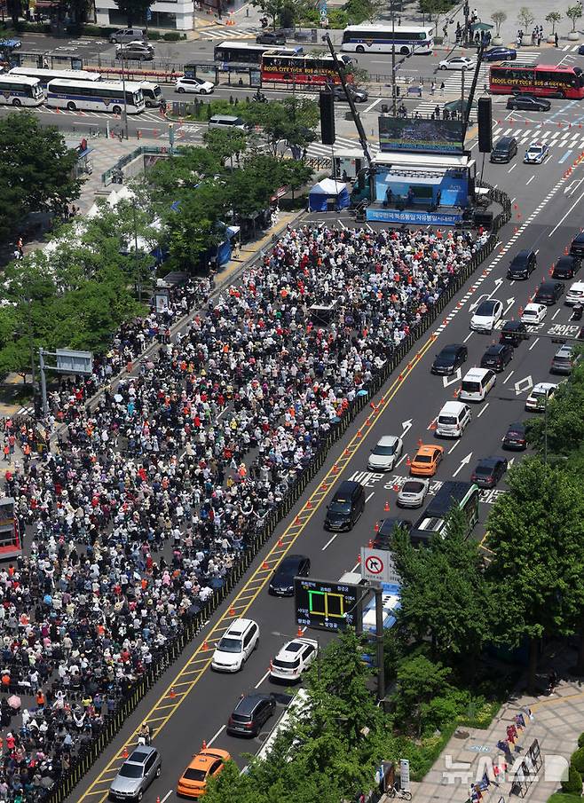 [서울=뉴시스] 조수정 기자 = 사랑제일교회 전광훈 목사 등이 25일 서울 종로구 동화면세점 앞에서 중구 서울시의회까지 이어지는 편도 전차로에서 전국주일연합예배를 하고 있다. 2025.05.25. chocrystal@newsis.com