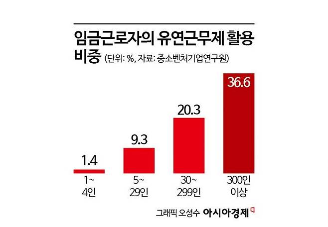 중소기업의 유연 근무제 활용 비중은 2021년 12.9%, 2022년 12.0%, 2023년 11.8%로 계속 감소했다. 기업 규모별로는 1~4인은 1.4%, 5∼29인은 9.3%, 30∼299인은 20.3%로 각각 나타났다.