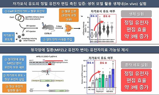 카스9 유전자 가위와 형광 단백질 유전자를 담은 DNA를 생쥐의 망막에 주입한 뒤 자가포식 유도제를 투여한 결과, 유전자 교정이 성공적으로 이뤄져 강한 형광 신호가 확인됐다.