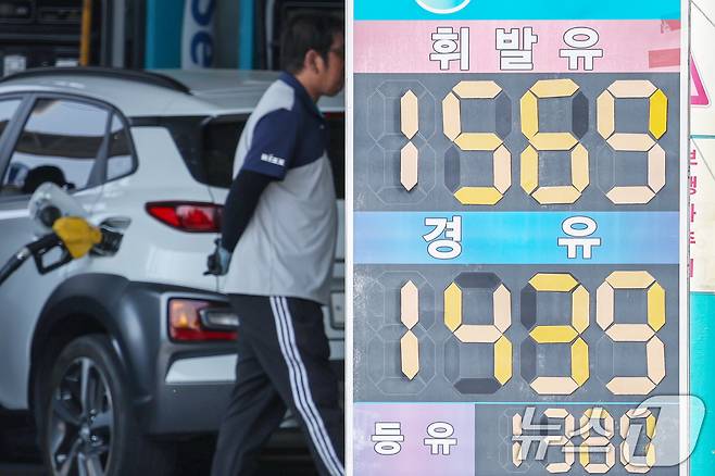 25일 서울의 한 주유소에서 휘발유와 경유가 각각 리터당 1,569원과 1,439원에 판매되고 있다. 2025.5.25/뉴스1