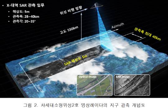 영상레이더는 KAIST 우주연구원이 국내 최초로 설계, 제작, 지상시험·평가를 거쳐 국산화한 것으로, 해상도 5m, 관측폭 40㎞의 X-대역 레이다영상 획득을 목표로 개발됐다. 전자파를 이용한 능동센서로 구성된 영상레이다는 주야간과 기상조건에 관계없이 전천후 영상 획득이 가능하다. 어두운 밤이나 구름 또는 비가 많은 기상환경에서도 관측할 수 있어 한반도처럼 강우와 구름이 빈번한 지역에 활용된다.