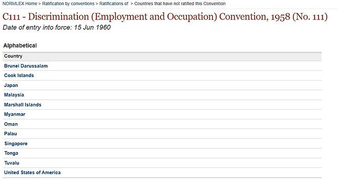 | ▲ 한편 ILO 누리집에 따르면 고용 및 직업에 있어 국적 차별을 금지한 111호 협약을 비준하지 않은 국가는 미얀마, 브루나이, 투발루 등 전 세계 12개국뿐이다. OECD 가입국 중에서는 미국과 일본만이 해당 협약을 비준하지 않고 있다. |