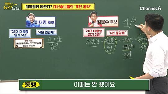 이번 대선 이슈로 오른 ‘개헌’ 공약은 이재명‧김문수 후보에겐 해당이 안 됩니다. 다음 대통령부터 적용시키겠다는 건 똑같은데요. 자신이 대통령으로 당선되면 ‘5년 단임제’로 끝내는 대신, 다음 대통령부터는 ‘4년 연임제’나 ‘4년 중임제’를 실시한다는 거죠.