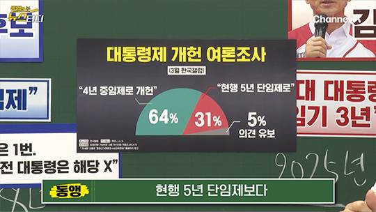 김문수 후보는 “대선과 총선 주기를 맞춰야 한다”면서 이번 대통령 임기는 3년만 해야 한다고 합니다. 3년 후인 2028년 총선이 있죠. 이때 대선도 함께 치르고, 22대 대통령부터는 임기를 4년으로 하자는 이야기입니다. 그러면 2032년에 또 총선과 대선을 치르게 됩니다. 이렇게 대선과 총선을 맞추면, 그 사이 지방선거가 치러지는데요. 이 지방선거로 중간 평가를 받자는 계획입니다. 그러려면, 이번 대통령 임기는 2025년부터 2028년까지 3년만 해야 한다는 논리죠.