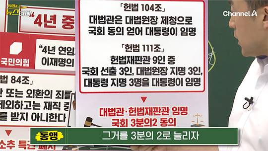 대법관과 헌법재판관의 임명 관련해서는, 개헌을 해서 국회 3분의 2의 동의를 얻어야 대통령이 임명할 수 있도록 고치자고 합니다. 과반인 150석이 아니라 200석 이상의 동의로 확대해서, 국회 다수당이 밀어붙이지 못 하게 하겠다는 겁니다.