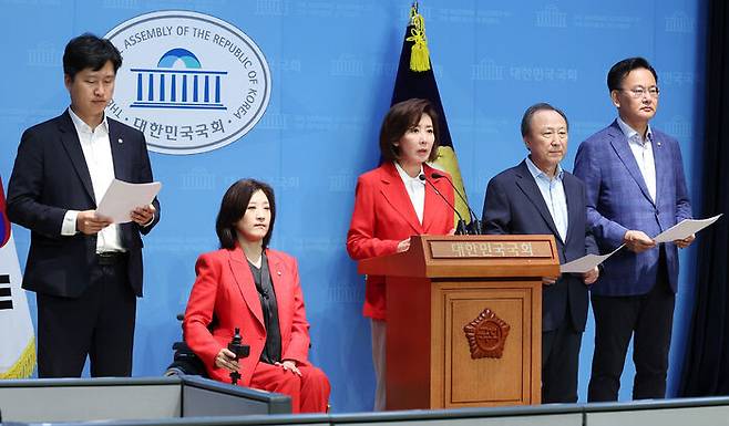 ▲ 국민의힘 김문수 대통령후보 직속 사법독립수호·독재저지 투쟁위원회 위원장인 나경원 의원과 유상범, 최보윤 의원 등이 25일 서울 여의도 국회 소통관에서 "민주당 사법장악 만행 및 전국법관대표회의" 관련 기자회견을 하고 있다.