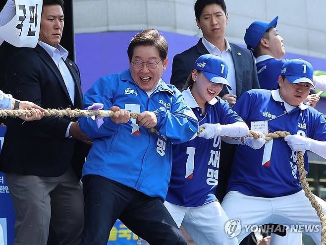(당진=연합뉴스) 김주성 기자 = 더불어민주당 이재명 대선 후보가 '캐스팅보트'로 꼽히는 충남지역 유세에 나선 25일 기지시 줄다리기의 고장 충남 당진시 당진전통시장에서 열린 유세에서 '국민편 대 기득권편 줄다리기' 퍼포먼스를 하고 있다. 2025.5.25