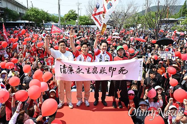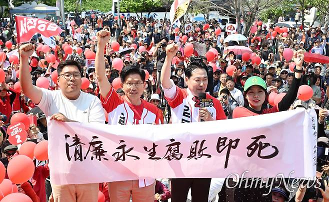 | ▲ 김문수 국민의힘 대선 후보가 25일 충남 보령시 대천역 광장에서 '청렴영생 부패즉사'가 적힌 붓글씨를 들고 기념촬영을 하고 있다. 오른쪽은 장동혁 의원. |