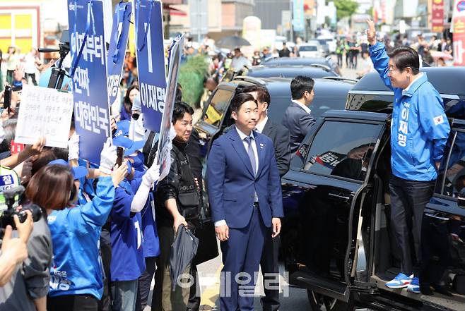 [이데일리 노진환 기자] 이재명 더불어민주당 대선 후보가 25일 오후 충남 당진시 당진전통시장에 도착해 차량에서 내리며 시민들에게 인사하고 있다.