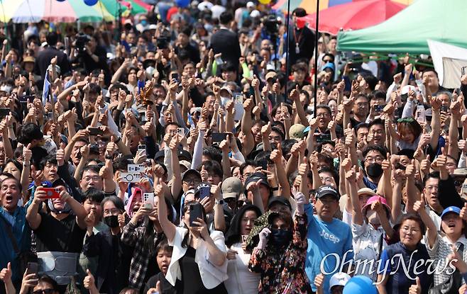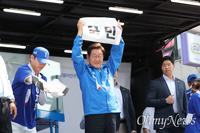 | ▲ 이재명 더불어민주당 대선 후보가 25일 충남 당진시 당진전통시장 입구에서 지지를 호소하고 있다. |