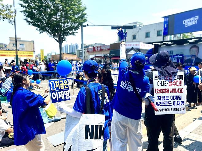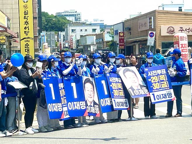 | ▲ 이재명 후보 당진 방문을 앞두고 사전 유세에서 시민들이 이재명 후보 지지를 호소했다. |
