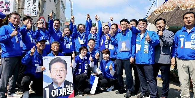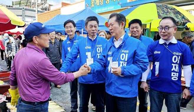 25일 오전 9시 정청래 더불어민주당 의원(국회 법제사법위원장)이 전남 완도군 5일장을 찾아 선거운동원들과 지역 주민들과 일일이 악수하며 "국민의 삶을 제대로 돌볼 수 있는 후보는 이재명"이라며 더불어민주당 이재명 대선 후보에 대해 지지를 호소했다. 이준경 기자