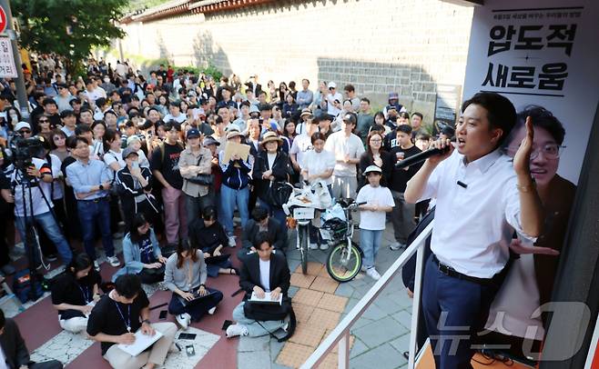 (서울=뉴스1) 허경 기자 = 이준석 개혁신당 대통령 후보가 25일 서울 종로구 서순라길을 찾아 유세를 하고 있다. (공동취재) 2025.5.25/뉴스1