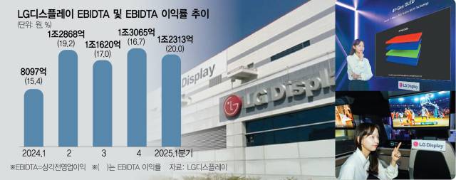 LG디스플레이(034220)가 차세대 유기발광다이오드(OLED) 중심으로 경영 정상화 고삐를 죄고 있는 가운데 연간 실적 턴어라운드 정조준에 나선다. 지난해 4분기에 이어 올해 1분기에도 영업이익 흑자 달성에 성공했을 뿐만 아니라 현금 창출 능력을 나타내는 상각전영업이익(EBITDA)도 4개 분기 연속 1조 원을 돌파했다. OLED 기술 차별화와 더불어 대형 액정디스플레이(LCD) 사업 종료 등 포트폴리오 재편을 통한 비용 효율화에 집중한 점이 주효했다는 설명이다.