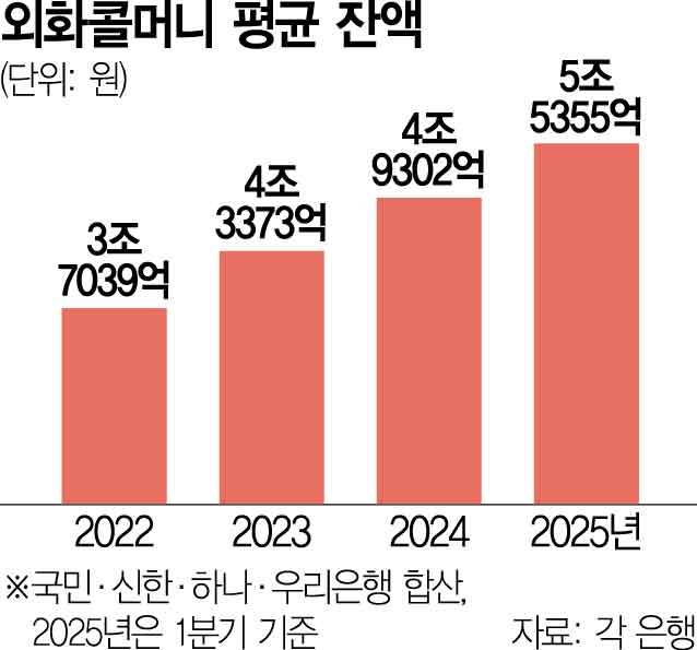 은행별로는 KB국민이 2조 4718억 원으로 가장 많았고 하나(1조 2299억 원)와 우리(1조 원), 신한(8338억 원) 등의 순서였다. 외화 콜머니는 은행이나 금융사 사이에서 만기 1일 이내의 초단기 외화자금을 거래하는 상품이다. 미국의 고율 관세 정책과 정치적 변동성 확대에 따른 환차손 리스크를 줄이기 위해 주요 은행들이 외화 콜머니 거래를 크게 늘린 것으로 보인다. 실제로 4대 은행의 외화 콜머니 평균 잔액은 △2021년 2조 6885억 원 △2022년 3조 7039억 원 △2023년 4조 3373억 원 등으로 수년간 2조~4조 원대를 유지해왔다.