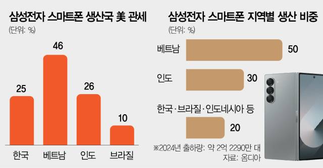 미국에 수출되는 삼성 스마트폰에는 기본 관세율인 10%가 부과되고 있다. 미국 정부가 지난달 초 국가별 상호관세율을 발표했지만 이후 적용을 유예해 기본 관세만 적용되고 있다. 삼성전자의 글로벌 스마트폰 생산지인 베트남과 인도는 우리나라와 마찬가지로 높은 상호관세율이 매겨진 상태다. 특히 삼성전자 스마트폰 생산의 50% 이상을 차지하는 베트남은 46%의 초고율 관세가 부과됐다. 트럼프 대통령의 공언처럼 6월 말께 스마트폰에 최소 25% 관세가 현실화하면 미국 내 소비자 가격 상승도 불가피할 것으로 전망된다.