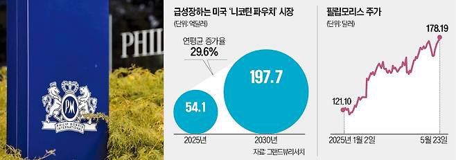 니코틴을 고체 형체로 뭉친 뒤 주머니에 넣어 잇몸과 입술 사이에 넣는 식으로 쓰는 ‘니코틴 파우치’도 새 먹거리 역할을 하고 있다. 니코틴 파우치는 한국에선 정식 판매되지 않지만 최근 미국과 유럽 등지에서 인기를 끌고 있다. 시장조사업체 그랜드뷰리서치는 올해 54억달러 수준인 미국 니코틴 파우치 시장이 2030년 197억달러 규모로 커질 것으로 예상했다.