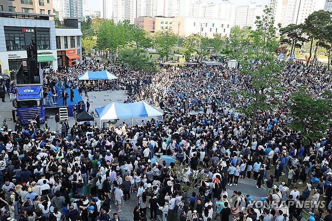 (아산=연합뉴스) 김주성 기자 = 더불어민주당 이재명 대선 후보가 '캐스팅보트'로 꼽히는 충남권 유세에 나선 25일 충남 아산시 탕정역 한들물빛공원을 가득 메운 시민들을 향해 지지를 호소하고 있다. 2025.5.25