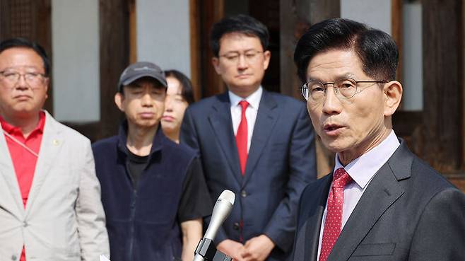 ▲ 국민의힘 김문수 대선 후보가 25일 충북 옥천군 육영수 여사 생가를 방문한 뒤 취재진 앞에서 현안 관련 입장 발표를 하고 있다.
