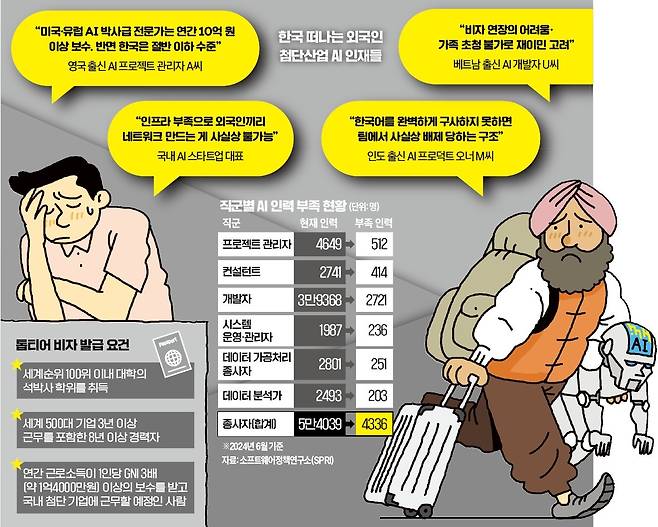 정부와 기업이 수백억원을 들여 어렵게 유치한 해외 인공지능(AI) 인재들이 한국에 도착한 지 몇 달도 안 돼 짐을 싸는 일이 속출하고 있다. 복잡한 비자 제도, 정착 지원 부재, 글로벌 기준에 못 미치는 근무환경까지 ‘삼중고’를 겪으면서다. “한국은 인재 유치가 아니라 유출의 허브”라는 말까지 나올 정도다.
