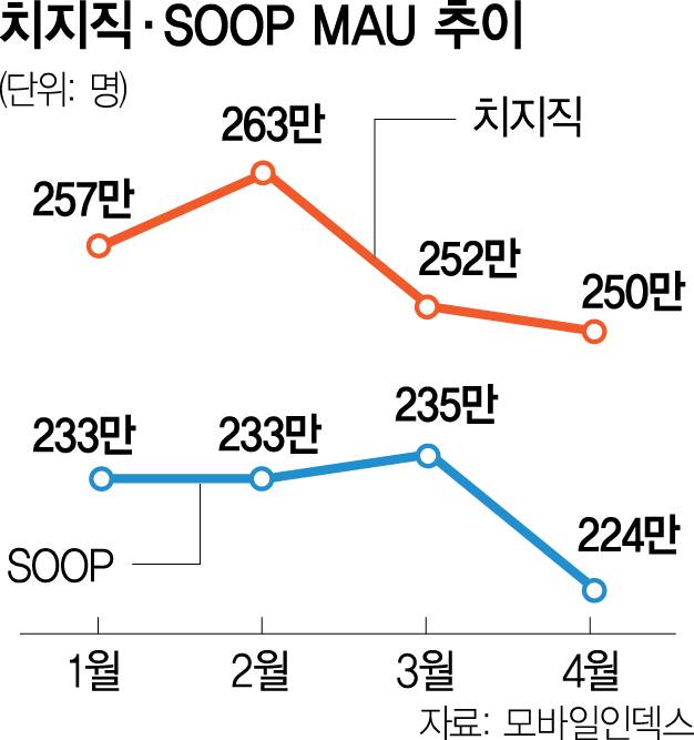SOOP은 지난해 10월 구독 서비스를 개편한 후 약 반 년 만에 다시 가격을 인상한다. 업계에서는 기존 국내 스트리밍 플랫폼 1위였던 SOOP이 최근 치지직에 밀리면서 가격 인상 등을 통한 공격적인 수익화에 나섰다고 분석한다. 모바일인덱스에 따르면 SOOP의 지난 달 기준 월간활성이용자(MAU)는 224만 명으로, 치지직(250만 명)과 약 26만 명 차이가 난다. 지난해 11월 처음으로 치지직에 추월 당한 SOOP은 점점 업계 2위로 굳어지고 있다.