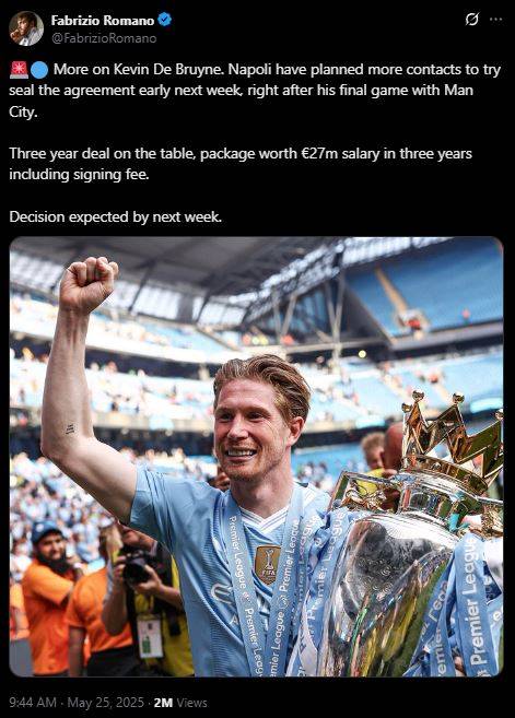 이적시장 소식에 정통한 파브리시오 로마노 기자는 25일 자신의 SNS를 통해 “케빈 더 브라위너 관련 추가 소식이다. 나폴리는 맨체스터 시티에서의 마지막 경기가 끝난 직후, 내주 초에 협상을 마무리 짓기 위해 추가 접촉을 진행할 계획”이라고 밝혔다.