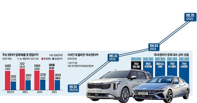 25일 한국렌터카사업조합연합회에 따르면 올해 1분기 기준 국내에 등록된 렌터카는 1년 전보다 4만 대 이상 늘어난 110만7070대로, 사상 처음 110만 대를 넘어섰다. 국내 렌터카는 2022년 101만 대로 100만 대를 돌파한 후에도 성장세를 이어가고 있다.