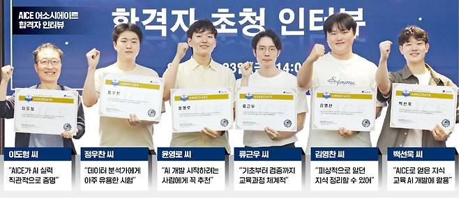 여섯 명의 합격자 역시 AICE 어소시에이트가 민간 공인 자격으로 지정돼 관심을 두게 됐다고 했다. 류근우 씨는 “한국경제신문과 KT가 같이 개발했고 공인 민간 자격으로 인정받았다는 점에서 신뢰할 수 있다고 생각했다”며 “교육 과정이 체계적이어서 AI 기초 실력을 갖추고 검증까지 할 수 있었다”고 말했다. 이도형 씨는 “지금까지는 AI 실력을 인증받을 방법이 논문밖에 없었다”며 “AICE가 내 AI 실력을 직관적으로 보여주는 역할을 할 것으로 기대한다”고 말했다.