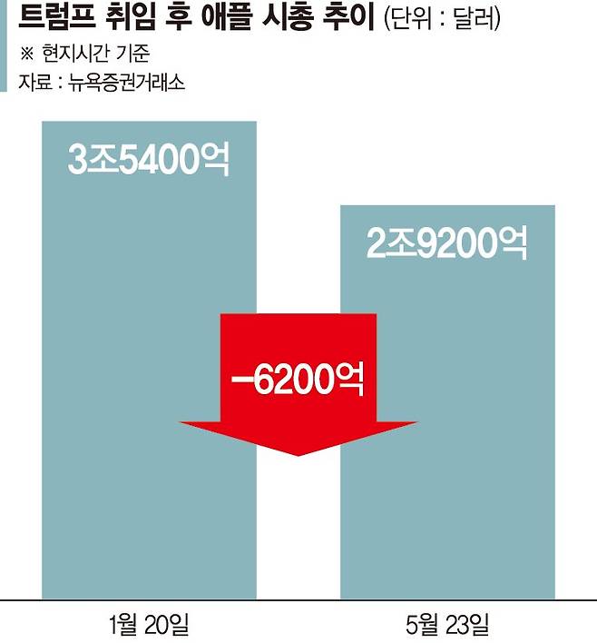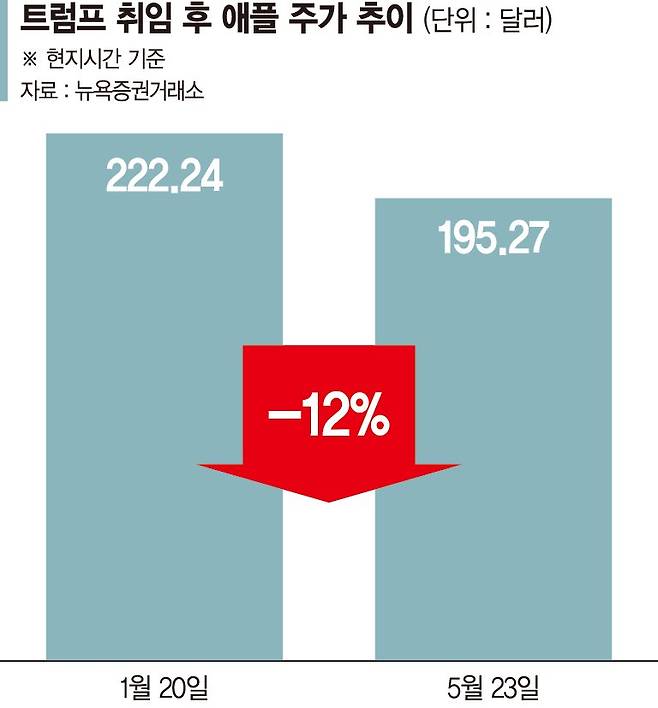 트럼프 대통령이 애플의 아이폰 생산공장을 강제로 중국에서 철수하도록 압박하는 것은 애플에 큰 충격을 줄 수 밖에 없다는 분석이다. 트럼프 대통령이 취임한 후 23일까지 애플 주가는 12% 하락했다. 같은 기간 시가 총액도 3조5400억 달러에서 2조9200억 달러로 6200억 달러가 줄어들었다.