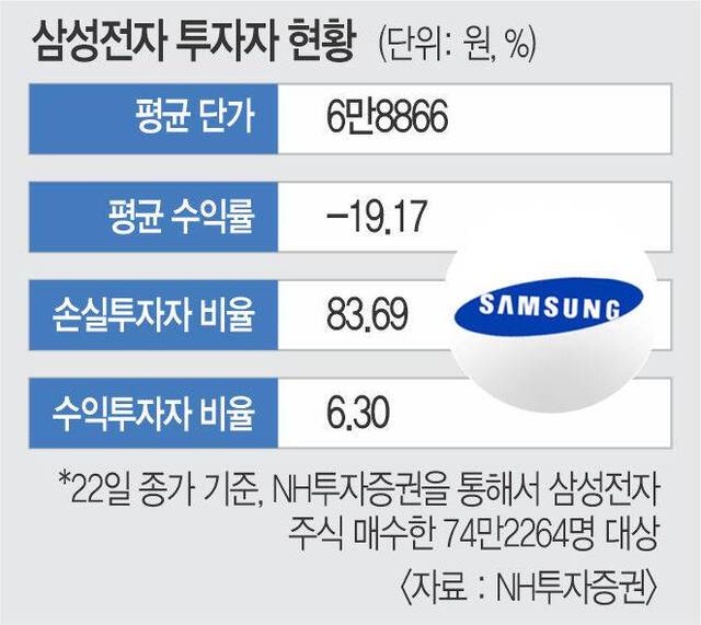 주가 상승 이벤트를 기다리던 투자자로선 실망스러운 소식이다. 이미 삼성전자에 투자한 개인 대부분은 손실을 보고 있다. 22일 기준 NH투자증권을 통해 삼성전자에 투자한 74만2264명의 삼성전자 평균 매수 단가는 6만8866원으로 이들의 수익률은 -19.17%로 집계됐다. 이 중 손실을 보는 투자자 비율만 93.69%다. 10명 중 9명 이상이 평가 손실을 보고 있다. 23일 기준 개인은 올해 들어 삼성전자 주식 7261억원 규모 순매수했다. 같은 기간 외국인은 4조2814억원 규모를 팔고 떠났다.