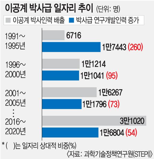 이와 달리 국내에서 이공계 박사 학위에 걸맞은 일자리는 박사 인력 배출 속도를 따라가지 못하고 있다. 2016~2020년 이공계 박사 배출 대비 박사급 과학기술 인력 일자리 증가 규모는 54%로 절반 수준이었다. 이 기간 이공계 박사 인력은 3만1020명 배출됐지만 일자리는 1만6804개 증가하는 데 그쳤다. 이공계 박사의 59.3%가 최소 학력 조건이 박사에 미치지 못하는 일자리에 종사한다는 조사 결과도 있다.