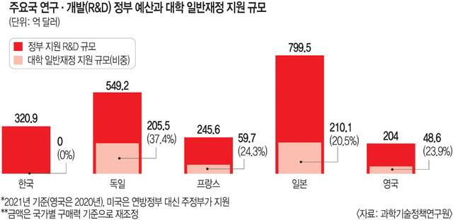 이 같은 문제의 근본적 배경은 국내 대학에서는 교수가 연구비 대부분을 경쟁 과제를 수주해 마련하는 데 있다. 이렇게 따온 정부나 기업 과제로 연구 장비, 대학원생 기본생활비, 연구 지원인력 운영비 등 비용 전반을 해결해야 한다. 정부가 지원하는 R&D 금액 중 최소 20%를 일반대학연구진흥금(GUF)으로 지원해 대학원생들에게 일정 소득을 보장하고 교원들의 과제 수주 부담을 줄여주는 주요국과 같은 완충장치가 한국에는 없다. 미국 역시 중앙정부 차원의 GUF 지원은 없지만 주정부 차원에서 대학을 일반재정으로 지원한다.