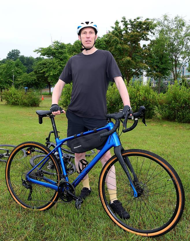 이번 자전거페스티벌에서 유독 눈에 띈 참가자가 있었다. 서울에서 온 게빈 이스턴(Gavin Easton·47·영국·사진)씨는 영어강사를 하고 있다. 자전거를 조금(?) 탄다던 그는 사실 인천에서 부산을 자전거로 왕복할 정도로 라이딩을 좋아한다. 인터넷을 통해 '제9회 경기친환경자전거페스티벌'을 알게 돼 참가했다.