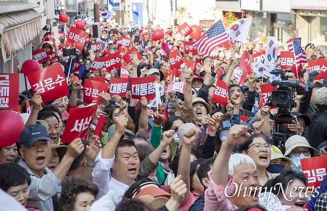 김문수 국민의힘 대선 후보 지지자들이 25일 충남 서산시 중앙통 로데오거리에서 김 후보의 유세를 지켜보며 환호하고 있다. 태극기와 성조기가 눈에 띈다.